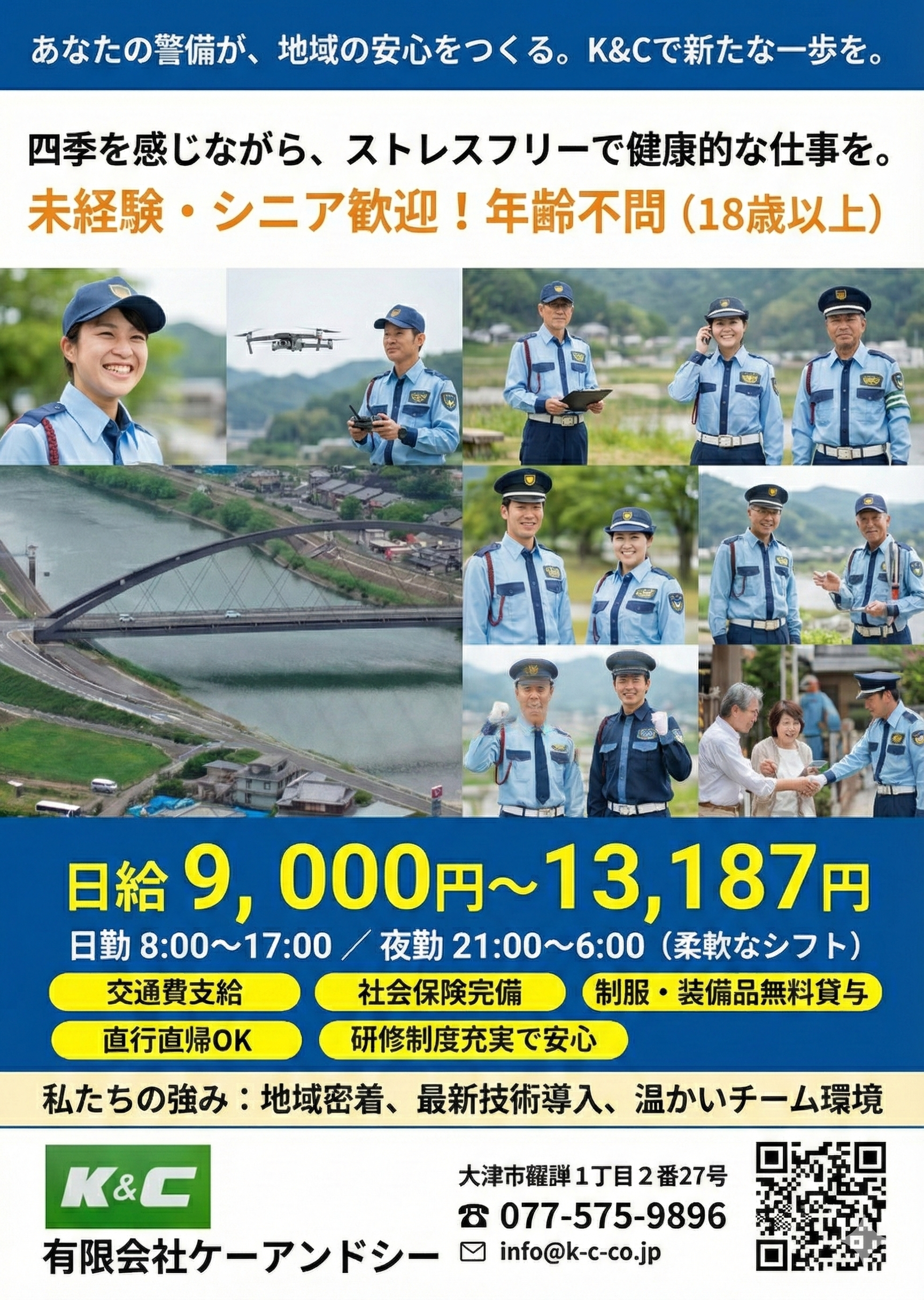 | 仕事内容 | 滋賀県内の一般道路にて歩行者・自転車・車などの誘導をお願いします。 国家資格の取得なども応援しております。(交通誘導2級・雑踏警備2級他) |